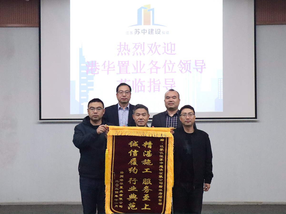 2024年11月7日上午,我公司迎來了揚州港華置業(yè)有限公司姚惠忠總經(jīng)理一行的特別拜訪,公司總經(jīng)理解志偉給予了熱情接待。在熱烈的氣氛中,姚惠忠總經(jīng)理向公司贈送了一面繡有“精湛施工、服務(wù)至上、誠信履約、行業(yè)典范”字樣的錦旗,表達了對公司翰林府項目部在項目建設(shè)中表現(xiàn)出的卓越品質(zhì)和優(yōu)良服務(wù)的肯定和感謝。