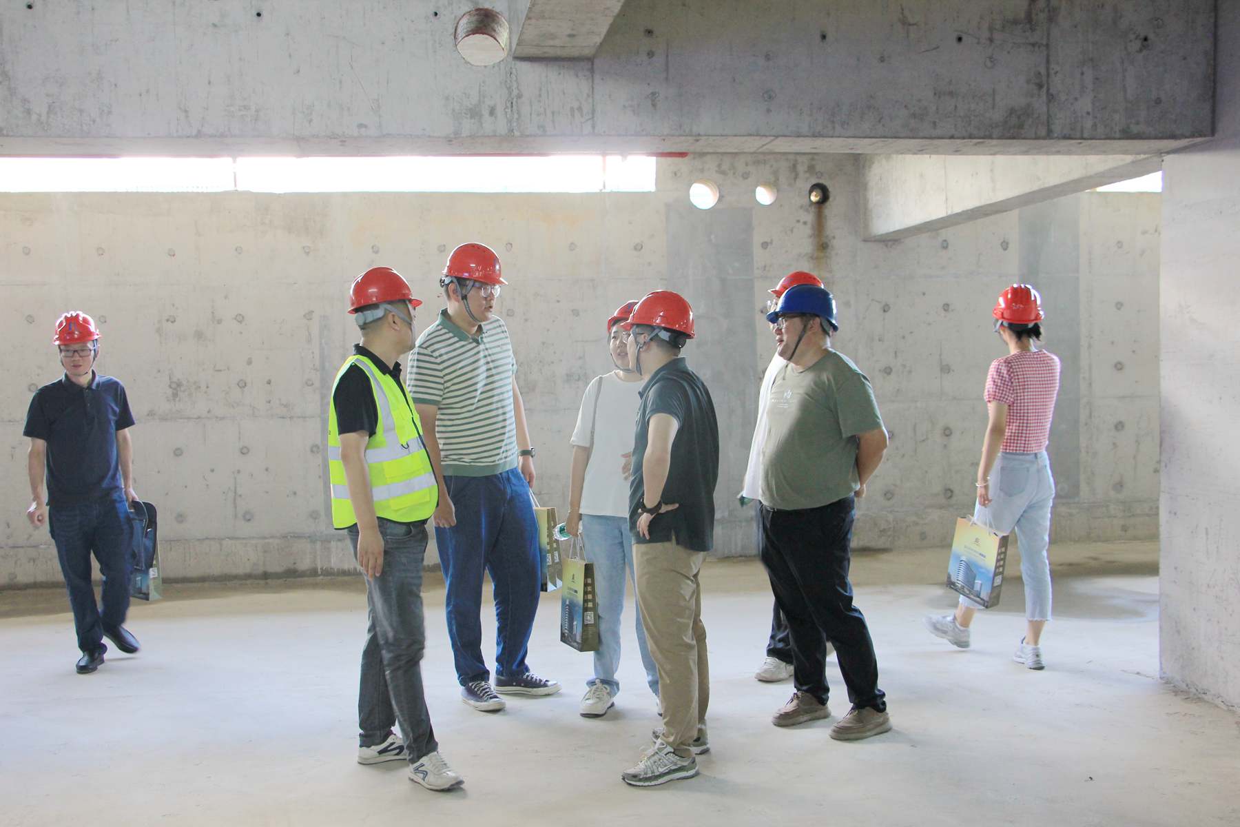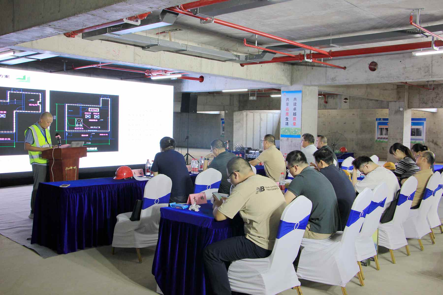 會上,大家首先參觀了該項目的防水施工現(xiàn)場,了解該項目具體防水施工措施亮點;項目負責人從混凝土結(jié)構(gòu)自防水方案、地下室自然通風(fēng)方案、設(shè)備管線穿梁方案、水泵房設(shè)備優(yōu)化方案等幾個設(shè)計創(chuàng)新點和大家做了交流,得到大家的肯定。